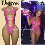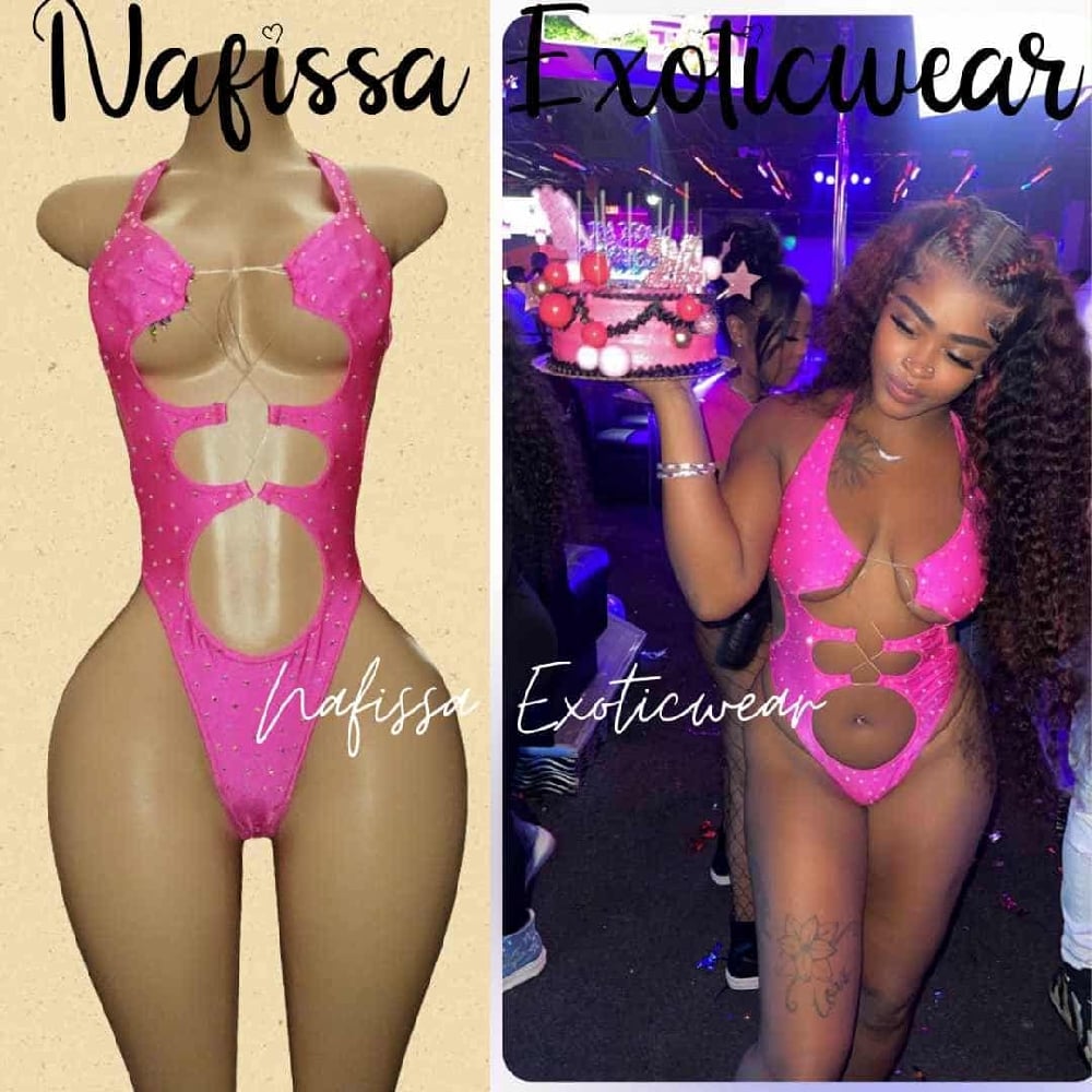 •Dive into summer fun with this electric hot pink 1-piece backless bodysuit that's practically a party itself! Covered in tiny, glimmering crystals, this suit makes you feel like a summer goddess glowing within.