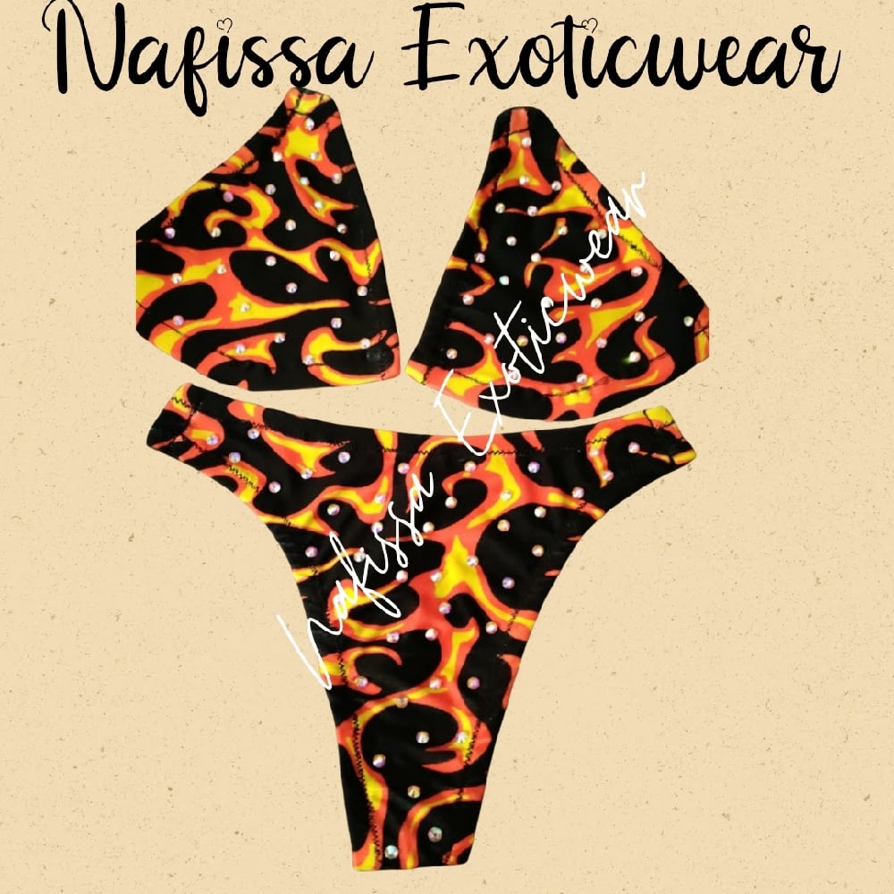 •Stand out at the beach, pool or clubs in this sparkling crystal flame thong set. The triangle top and matching bottoms feature a detailed flame pattern created with brilliant crystals. Made with a comfortable quick-drying material, this 2-piece set is perfect for swimming, sunbathing or clubbing.