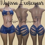 •Sparkle and shine in this royal blue crystal cutoff shorts. This two piece set features a star top.