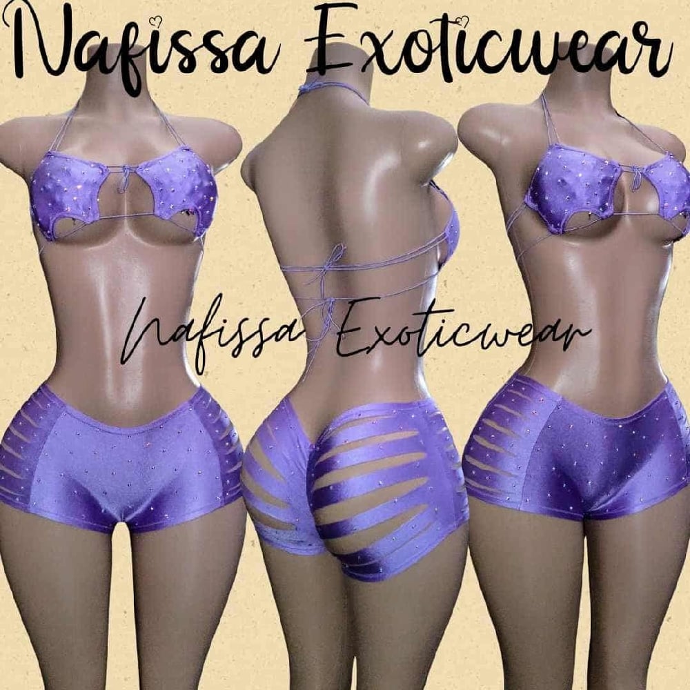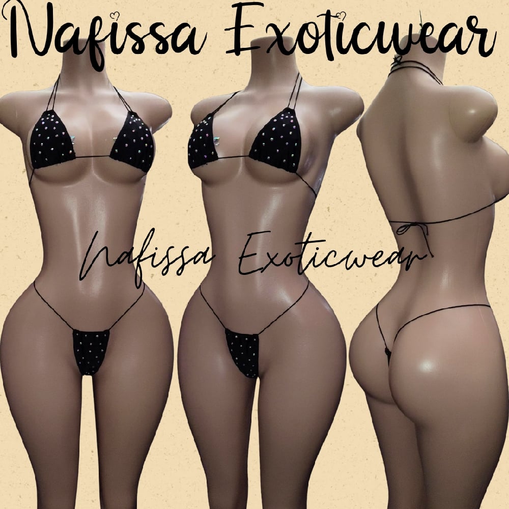 •"Steal the spotlight in our head-turning black crystal cutoff shorts. This three piece set features a triangle top and a thong.