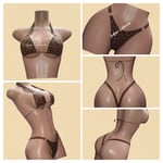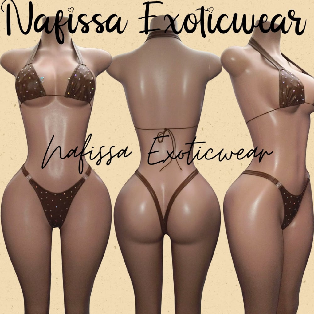 •"Our 2-piece brown thong set, with side clips and V shape back features a buttery-soft leather base meticulously embellished with dazzling crystals.