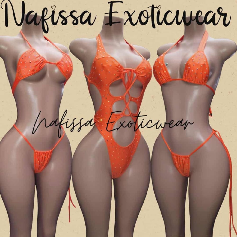 •Make a fierce statement this season in our stunning crystal tiger orange bikini set. This adjustable two piece set designed to catch every eye and command attention!