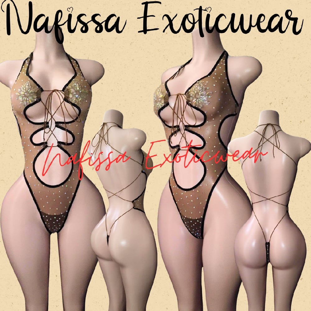 •Make a dazzling entrance with our crystal backless sheer mesh bodysuit. This stunning, form-fitting piece combines the allure of a sheer nude mesh base with a striking black outline that defines your curves. Adorned with sparkling, hand placed rhinestones, this 1-piece bodysuit offers maximum shine under club lights.