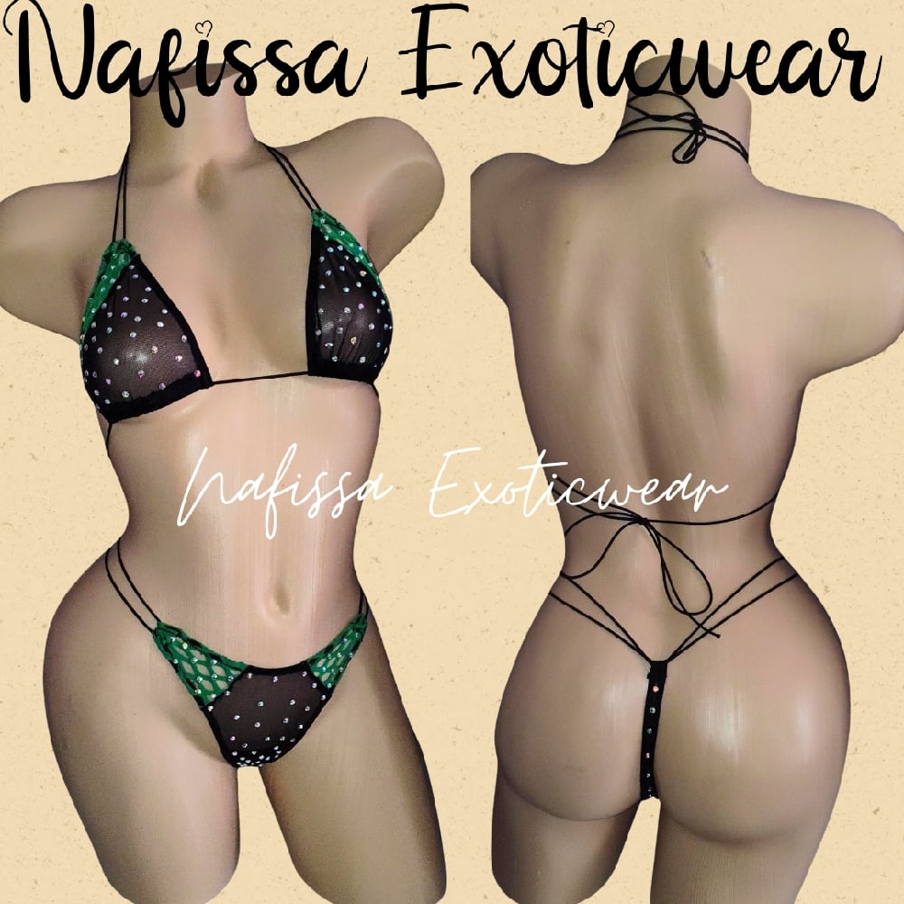 •Enhance your dance wear collection with this elegant crystal black mesh thong set, featuring a sophisticated blend of textures and colors. This 2-piece set combines sheer black mesh embellished with shimmering crystals and contrasting dark green net accents.